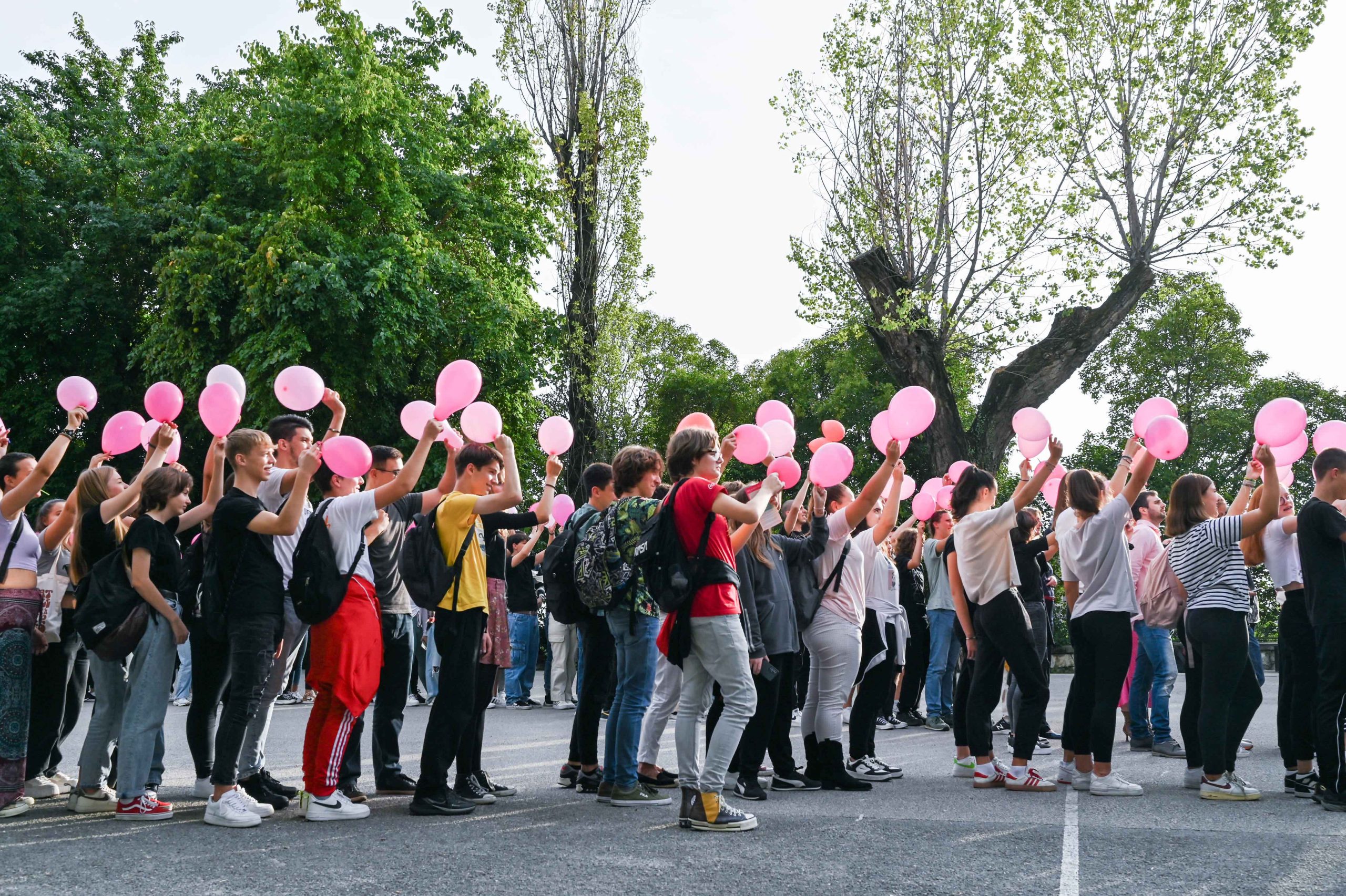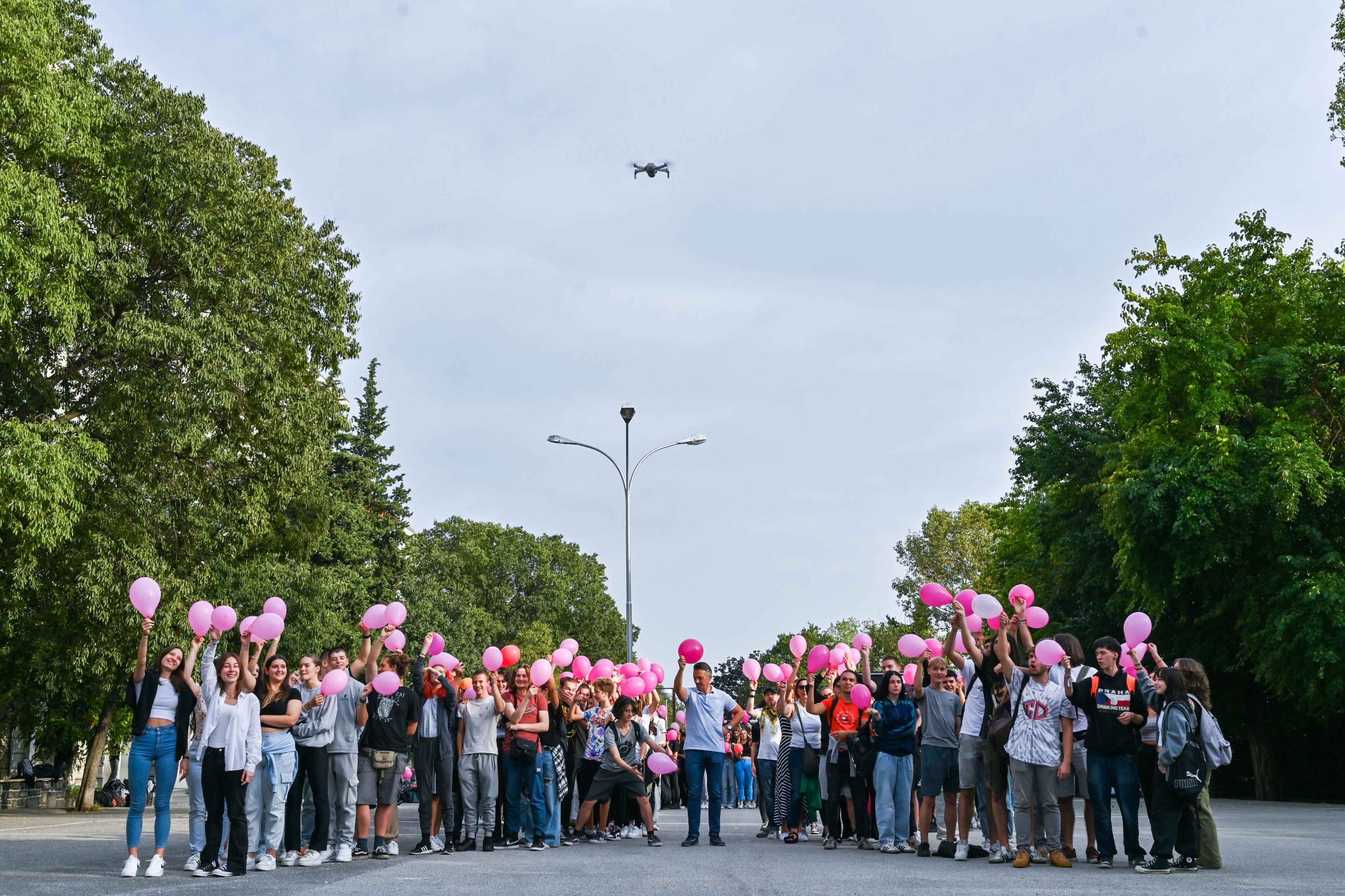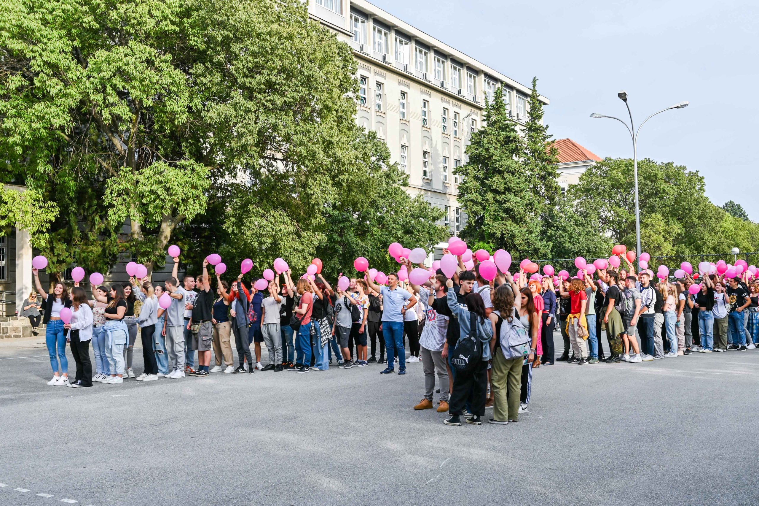 Ružičasti listopad”. Učenici i nastavnicima svojim su tijelima i balonima formirali simboličnu